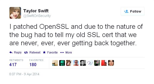 In my State of the OpenSSL Community talk, I compared the popularity of Taylor Swift when measured by Google search trends to Heartbleed. I did not know about this @SwiftOnSecurity joke or I would have included it in my slides. Next time!